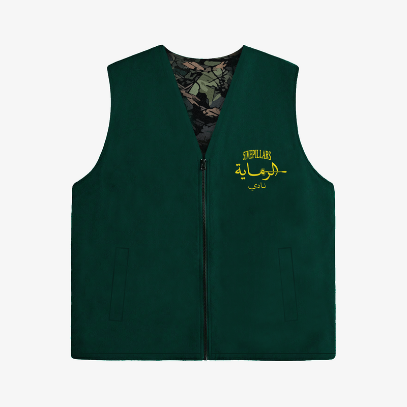 The Archery Club Vest's outer layer is made from 100% twill and is fully reversible, sporting both English and Arabic screen printed translations on either side. The front is also sublimated in a camouflage print, complete with pockets on both sides and a reversible metal black colored zip.
