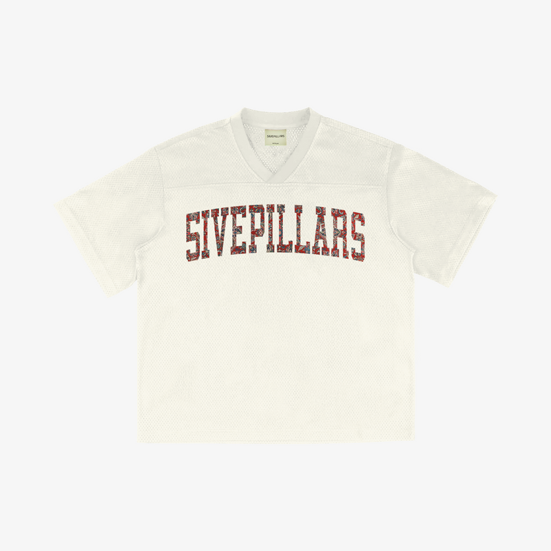 Our hockey tees come in two variants, green and off-white. Our off-white variant features a rug sublimation pattern on our front and back logos, with the front being our 5ivepillars college font logo, and the back sporting our classic ٥ logo that reminds us of the rugs of home.
