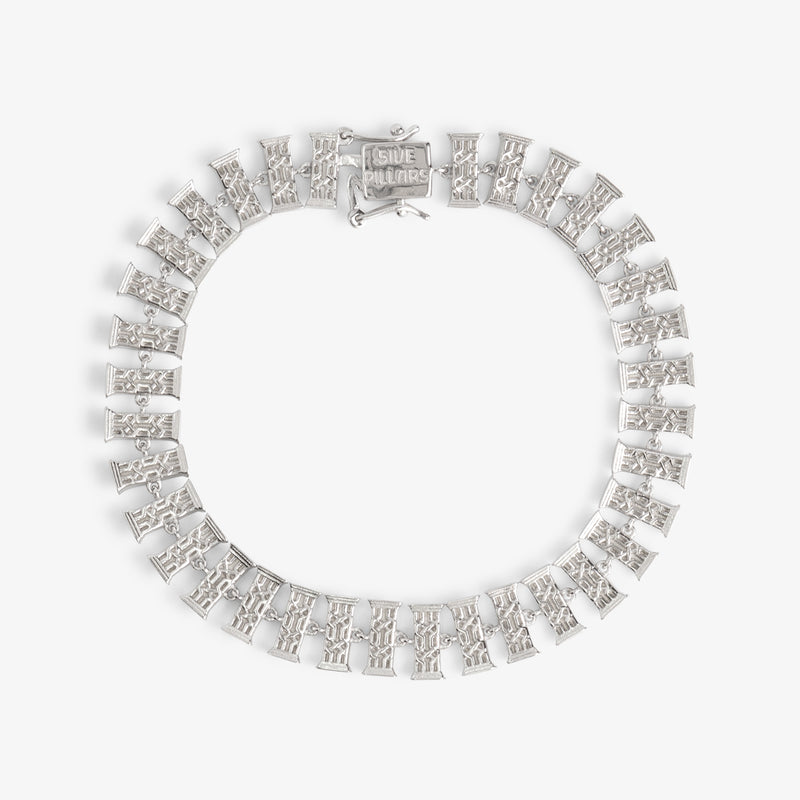 The 5ivepillars Pillars Bracelet is part of our unique fine jewelry collection. Available in a number of sizes, this bracelet is made of 925 Italian silver and features our pillars logo all around the bracelet in a boldly unique design, coupled with a 5ivepillars branded clasp.