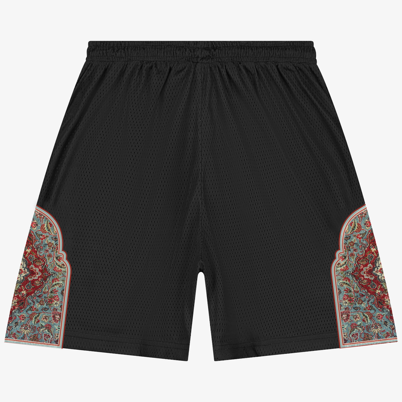 The shorts are double-lined and made with mesh as the outer layer. The shorts are sublimated with a rug pattern on the sides along with the classic ٥ logo; each variant sports a different rug design. The shorts are available in four colours - black, navy, cream, and forest green.