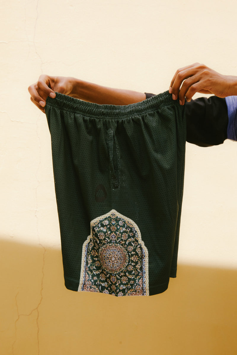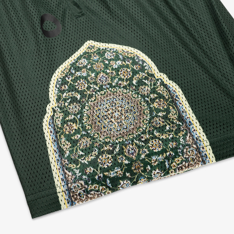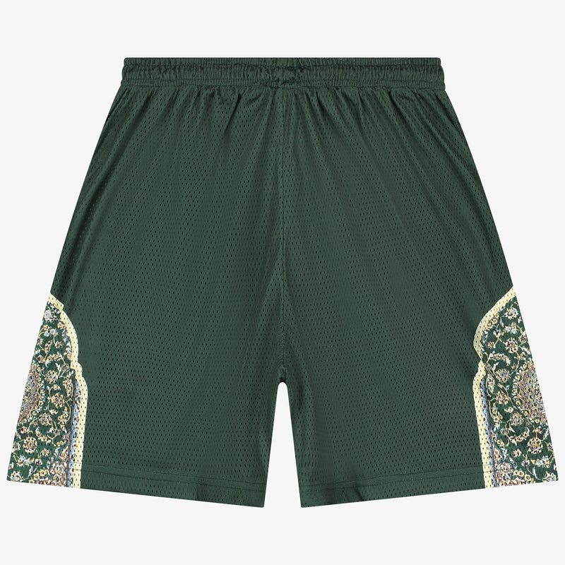The shorts are double-lined and made with mesh as the outer layer. The shorts are sublimated with a rug pattern on the sides along with the classic ٥ logo; each variant sports a different rug design. The shorts are available in four colours - black, navy, cream, and forest green.