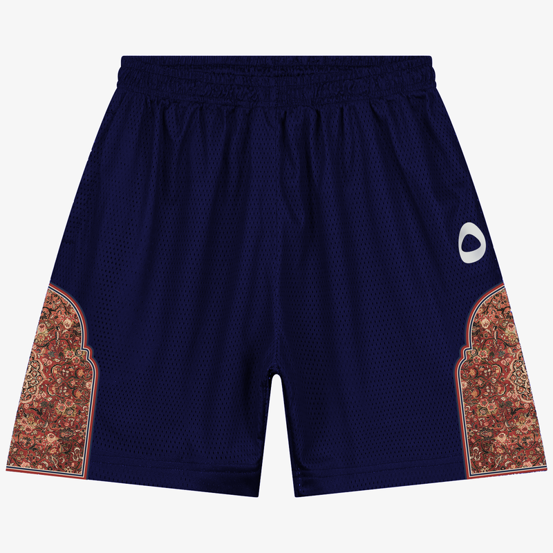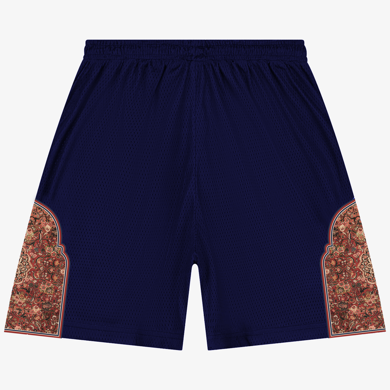 The shorts are double-lined and made with mesh as the outer layer. The shorts are sublimated with a rug pattern on the sides along with the classic ٥ logo; each variant sports a different rug design. The shorts are available in four colours - black, navy, cream, and forest green.
