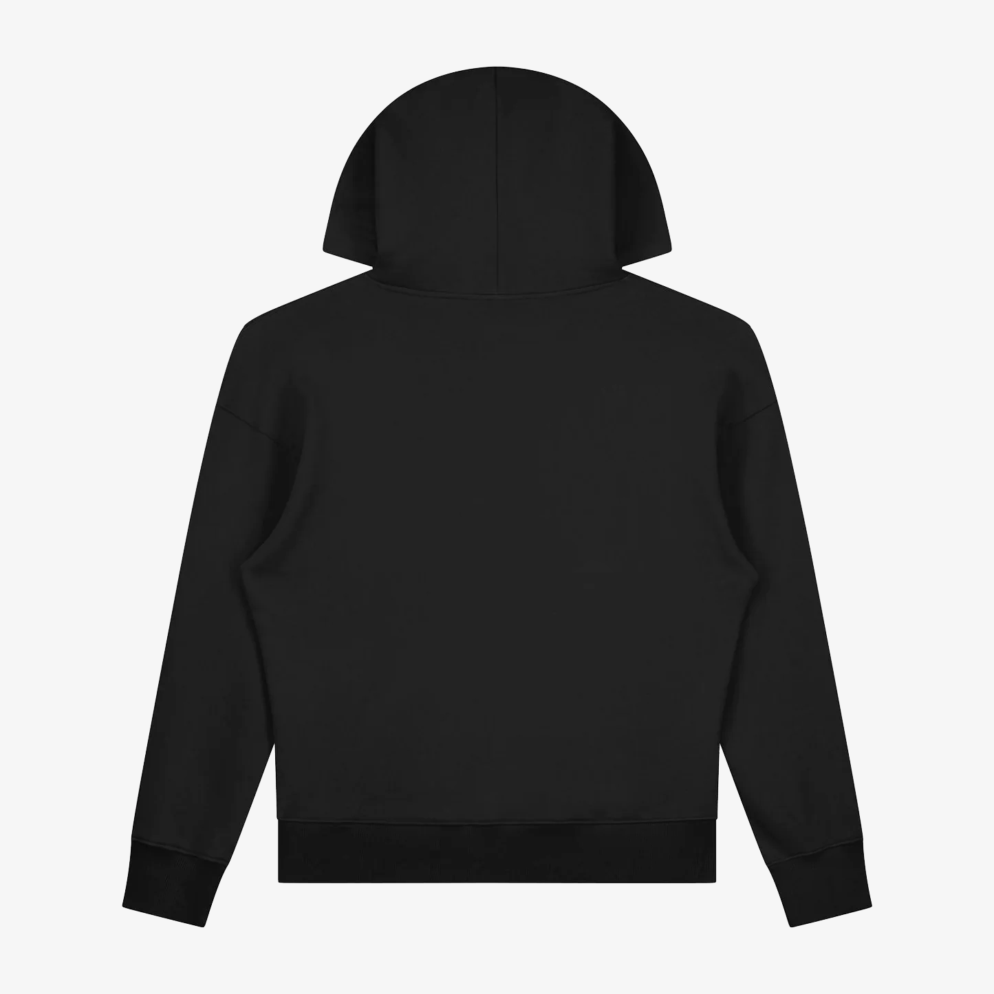Hoodie is unisex and features a drop shoulder relaxed fit.