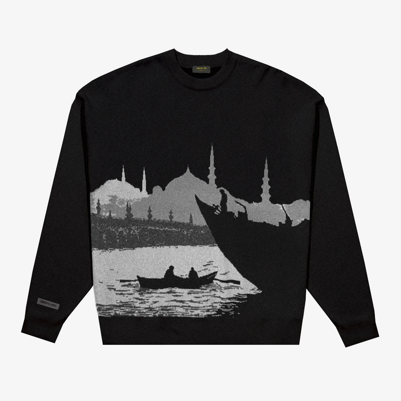 The Istanbul Knit Crewneck is knitted using a blend of yarn featuring acrylic, polyester, nylon, and modal. It features a minimalistic graphic of the Bosphorus, the iconic river that separates Europe and Asia, symbolising the blend of cultures between east and west. The crewneck sports a relaxed and flowing fit for a comfortable feel.