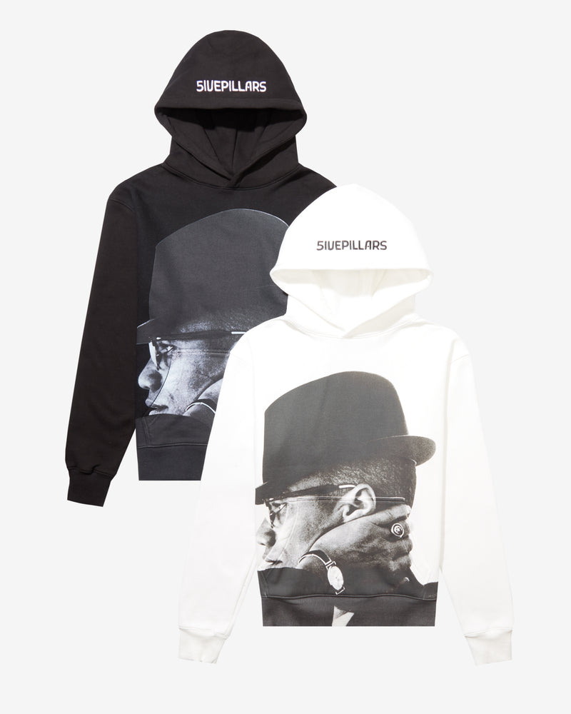 Made with 360 GSM cotton fleece fabric, the hoodie features an official Malcolm X image digital printed on the front of the hoodie, with the classic 5ivepillars logo embroidered at the hood. The garment also sports a kangaroo pocket at the front, complete with ribbed sleeves and hem.