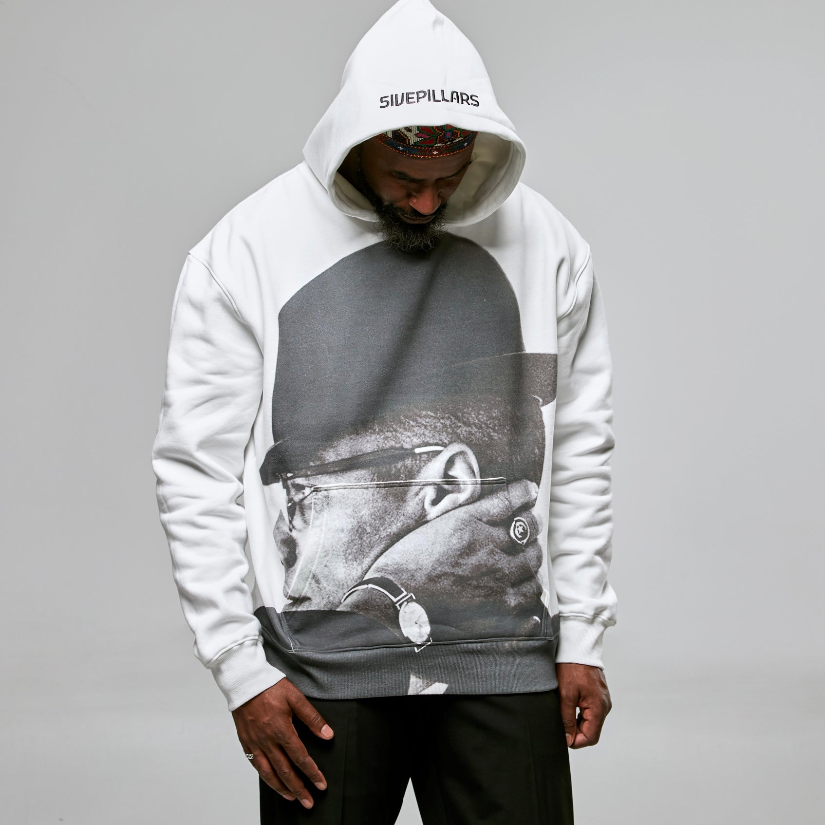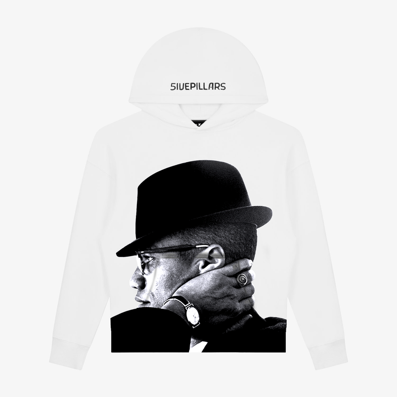 Made with 360 GSM cotton fleece fabric, the hoodie features an official Malcolm X image digital printed on the front of the hoodie, with the classic 5ivepillars logo embroidered at the hood. The garment also sports a kangaroo pocket at the front, complete with ribbed sleeves and hem.